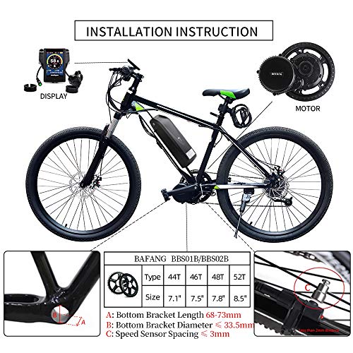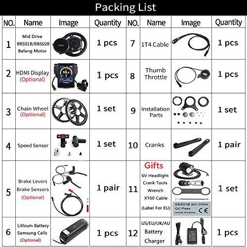 [All Included]: It comes with everything that you need to convert your electric bicycle and ready to enjoy the freedom of climbing up hills without any problem. One set Included: A 750W Bafang Mid Motor, a display(optional), chain wheel, speed sensor, brake lever (default) or sensor(send email to change), 1T4 cable, thumb throttle, installation parts, cranks, a headlight, wrench and removal tool. Compatible battery is optional.